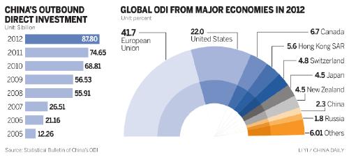 China's outbound direct investment reached a record high of $87.8 billion in 2012, making it the wor