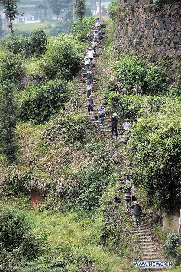 Farmers prepare to put fish in the terraced fields in Xiaozhoushan Township of Qingtian County, east China's Zhejiang Province, May 29, 2014. Local farmers have the long tradition of raising fish in the rice fields. (Xinhua/Xu Yu)