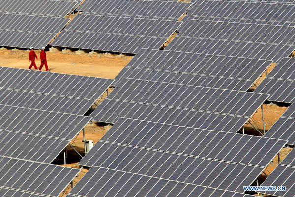 Workers patrol among the photovoltaic equipments in Hami, northwest China's Xinjiang Uygur autonomous region, March 16, 2012.(Photo/Xinhua)