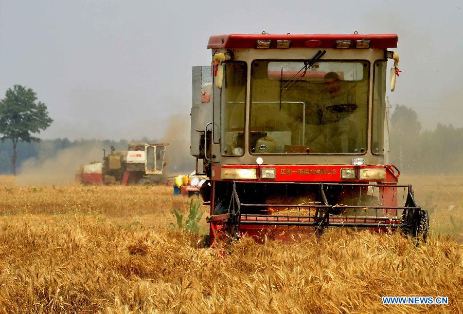 Combine harvesters work in a wheat field in Yangzhuang Village under Yuanyang County, central China's Henan Province, June 3, 2014. Harvest work is in progress amid wheat fields in Henan, a major producing area of the crop. (Xinhua/Wang Song)