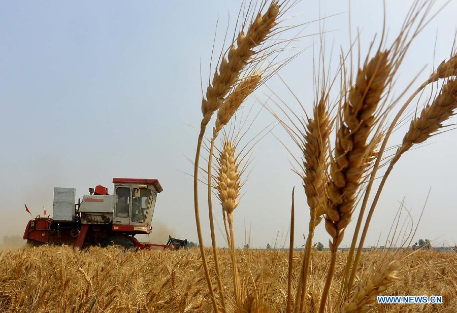 A combine harvester works in a wheat field in Qiaobei Township under Yuanyang County, central China's Henan Province, June 3, 2014. Harvest work is in progress amid wheat fields in Henan, a major producing area of the crop. (Xinhua/Wang Song)