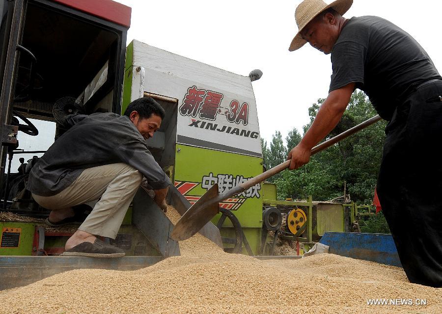 Villagers work by a wheat harvester in Gengzhuang Village under Changge City, central China's Henan Province, June 4, 2014. Harvest work is in progress amid wheat fields in Henan, a major producing area of the crop. (Xinhua/Li An)