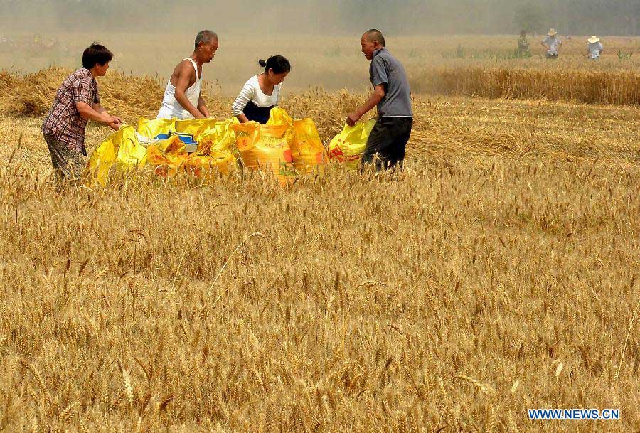 Farmers collect harvested wheat in Huzhuang Village under Yuanyang County, central China's Henan Province, June 3, 2014. Harvest work is in progress amid wheat fields in Henan, a major producing area of the crop. (Xinhua/Wang Song)