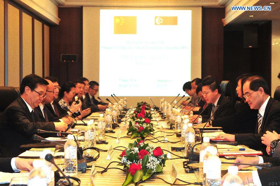 China's Minister of Commerce Gao Hucheng (1st L) and Singapore's Trade and Industry Minister Lim Hng Kiang (1st R) attend the fourth meeting of the Singapore-China Investment Promotion Committee (IPC) held at Singapore's Marina Mandarin, June 5, 2014. (Xinhua/Then Chih Wey)