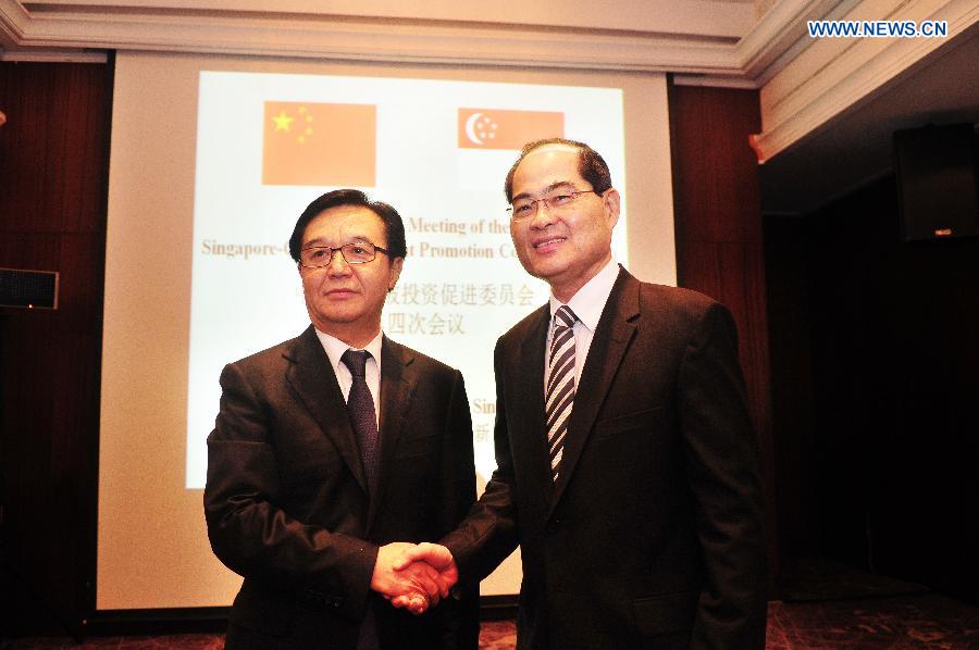 | China's Minister of Commerce Gao Hucheng (L) shakes hands with Singapore's Trade and Industry Minister Lim Hng Kiang during the fourth meeting of the Singapore-China Investment Promotion Committee (IPC) held at Singapore's Marina Mandarin, June 5, 2014. (Xinhua/Then Chih Wey) |