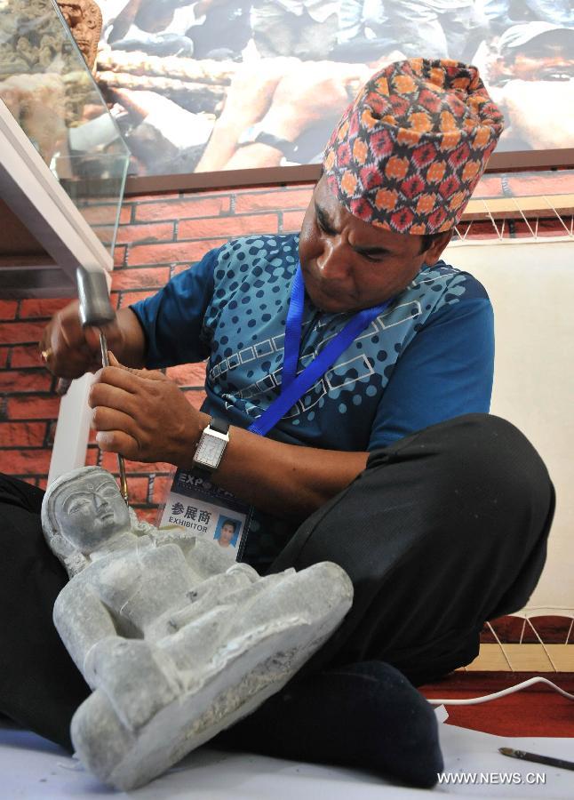 An exhibitor from Nepal makes a sculpture in the 2nd China-South Asia Expo in Kunming, capital of southwest China's Yunnan Province, June 6, 2014. Over 1,000 enterprises from 46 countries and regions took part in the expo which will last till June 10. (Xinhua/Lin Yiguang)