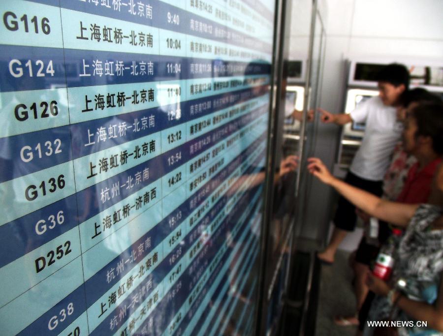 Passengers check CRH train information at Changzhou North Railway Station of the Beijing-Shanghai High-Speed Railway in Changzhou, east China's Jiangsu Province, July 3, 2011. The Beijing-Shanghai (or Jinghu) High-Speed Railway marked its third operation anniversary on Monday. The 1,318-kilometer high-speed railway that links Beijing, China's capital, and Shanghai, the largest city in the country, has seen more than 220 million passengers during the three years since its innitial operation on June 30, 2011. (Xinhua/Yang Baosen)