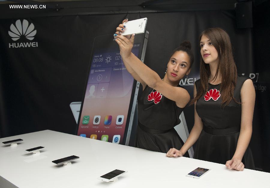 Staff members take a selfie with Huawei Ascend P7 smartphone during a presentation in Zagreb, Croatia, July 3, 2014. Huawei launched new flagship smartphone Ascend P7 in Zagreb on Thursday. (Xinhua/Miso Lisanin)