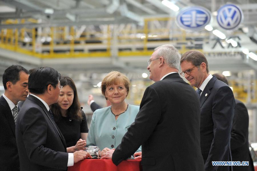 German Chancellor Angela Merkel (C) visits the branch company of FAW-Volkswagen in Chengdu, capital of southwest China's Sichuan Province, July 6, 2014. Merkel is on her seventh China visit as chancellor from July 6 to 8. (Xinhua/Xue Yubin)