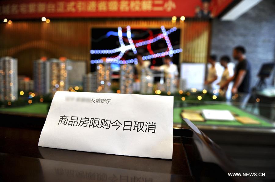 A notice shows the ending of home purchase restrictions at a sales office of new buildings in Jinan, capital of east China's Shandong Province, July 10, 2014. Jinan on Thursday lifted its three-year home purchase restrictions by allowing residents to buy more properties. (Xinhua/Xu Suhui)