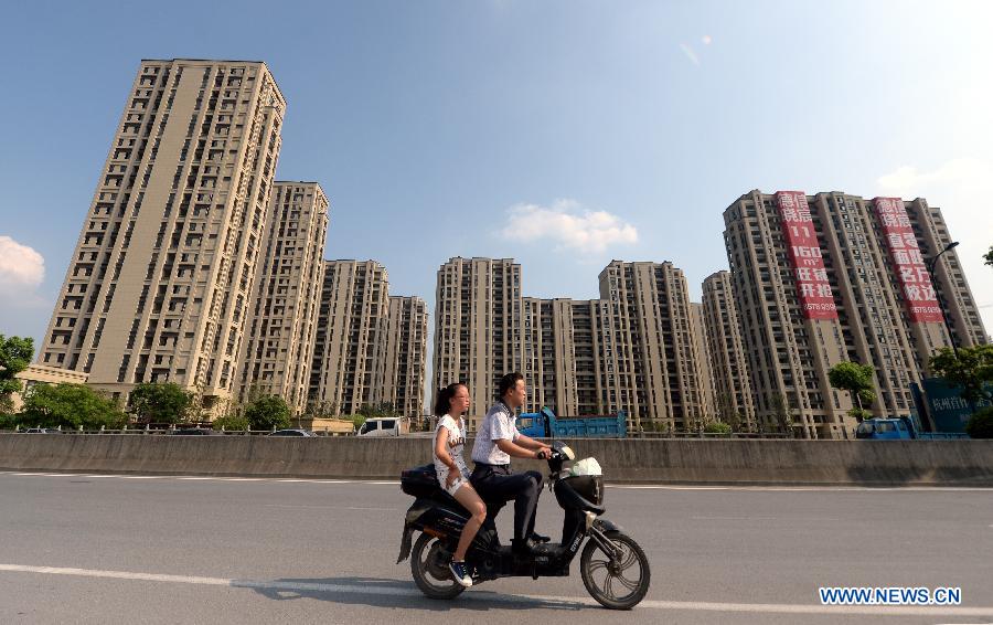 Riders pass by newly-built apartments in Hangzhou, capital of east China's Zhejiang Province, July 29, 2014. Hangzhou will lift the ban on buying a second home in Xiaoshan and Yuhang districts starting Tuesday, according to Hangzhou Housing Security and Management Bureau. The ban is also lifted for buyers purchasing a house more than 140 square meters in downtown areas, according to the bureau. So far, around 20 regions, mostly second- and third-tier cities where inventories are high, have lifted or eased bans on ownership of more than one home, imposed in early 2011 as a tool to cool the property market. (Xinhua/Wang Dingchang)
