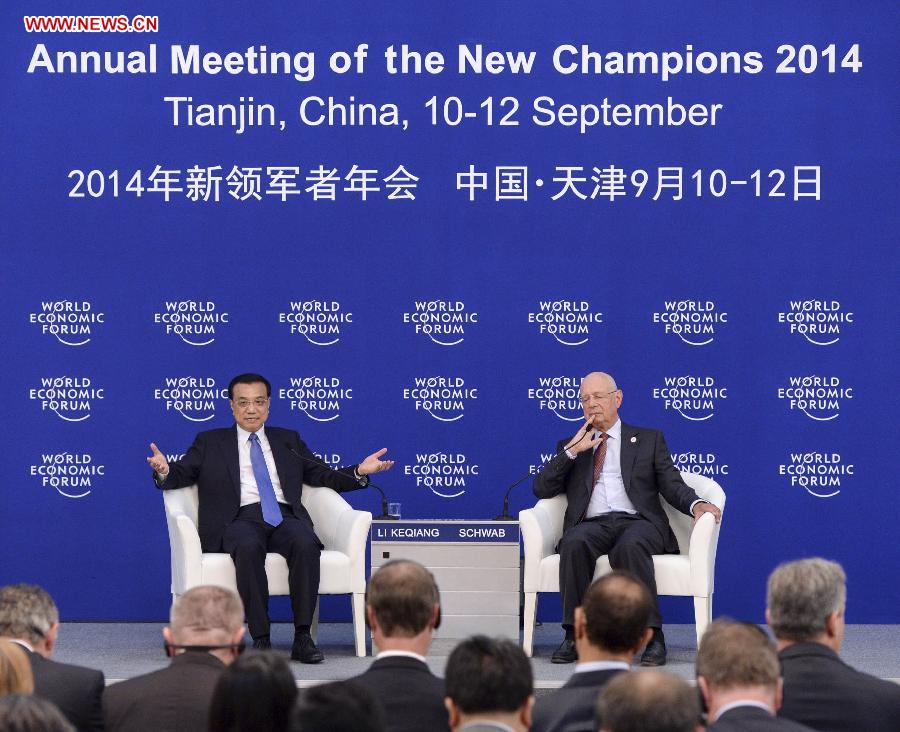 Chinese Premier Li Keqiang (L) and Klaus Schwab, founder and executive chairman of the World Economic Forum (WEF), attend a meeting ahead of the Summer Davos forum in Tianjin Municipality, north China, Sept. 9, 2014. (Xinhua/Wang Ye)