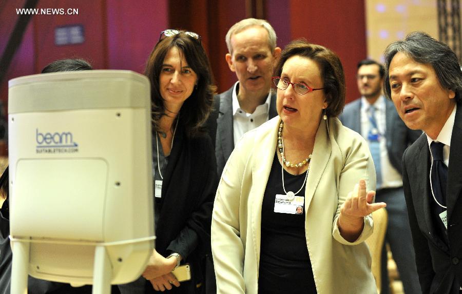 Delegates talk with Scott Hassan, CEO of America-based Suitable Technologies USA, through a remote robot mointoring system during the Annual Meeting of the New Champions 2014, also known as the Summer Davos forum, in Tianjin, north China, Sept. 11, 2014. (Xinhua/Yue Yuewei)