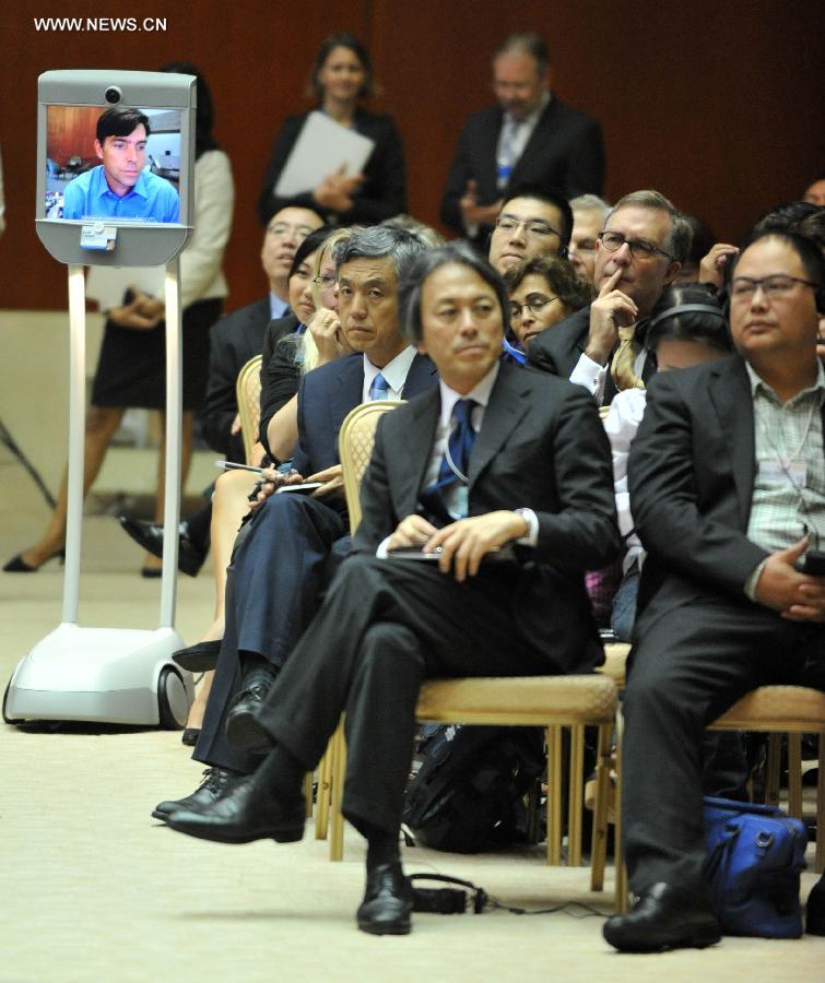 Delegates talk with Scott Hassan, CEO of America-based Suitable Technologies USA, through a remote robot mointoring system during the Annual Meeting of the New Champions 2014, also known as the Summer Davos forum, in Tianjin, north China, Sept. 11, 2014. (Xinhua/Yue Yuewei)