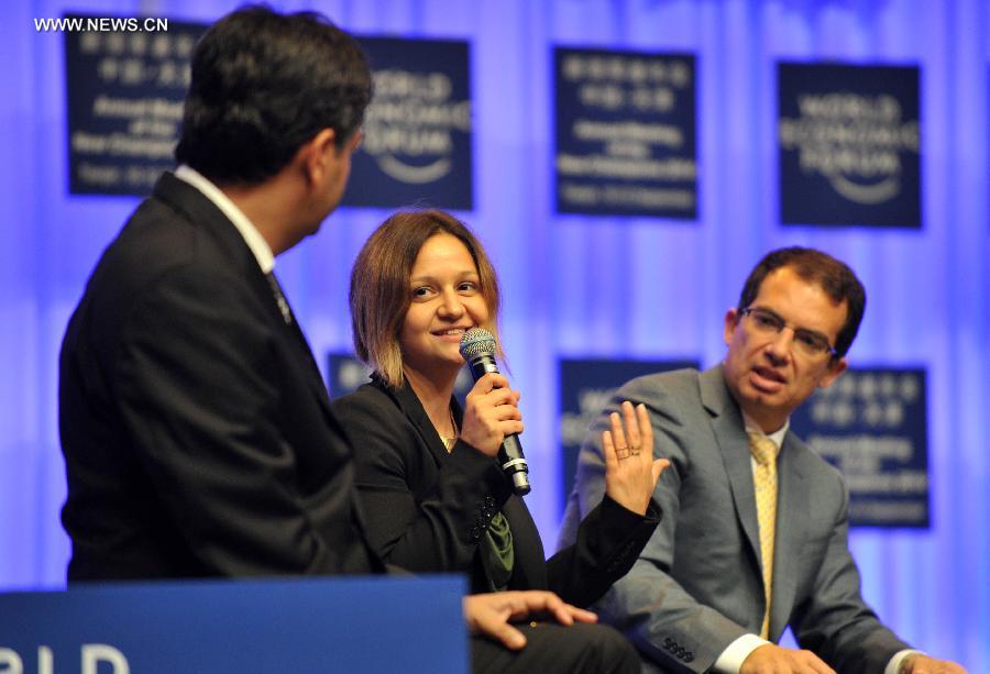 Ivana Gadjanski (C), associate professor of Serbia-based Belgrade Metropolitan University, speaks during the Annual Meeting of the New Champions 2014, also known as the Summer Davos forum, in Tianjin, north China, Sept. 11, 2014. (Xinhua/Yue Yuewei)