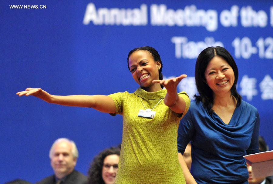 Matsi Modise (L), founder and chief executive officer of the South African Black Entrepreneurs Forum, interacts with audience during the Annual Meeting of the New Champions 2014, also known as the Summer Davos forum, in Tianjin, north China, Sept. 11, 2014. (Xinhua/Yue Yuewei)