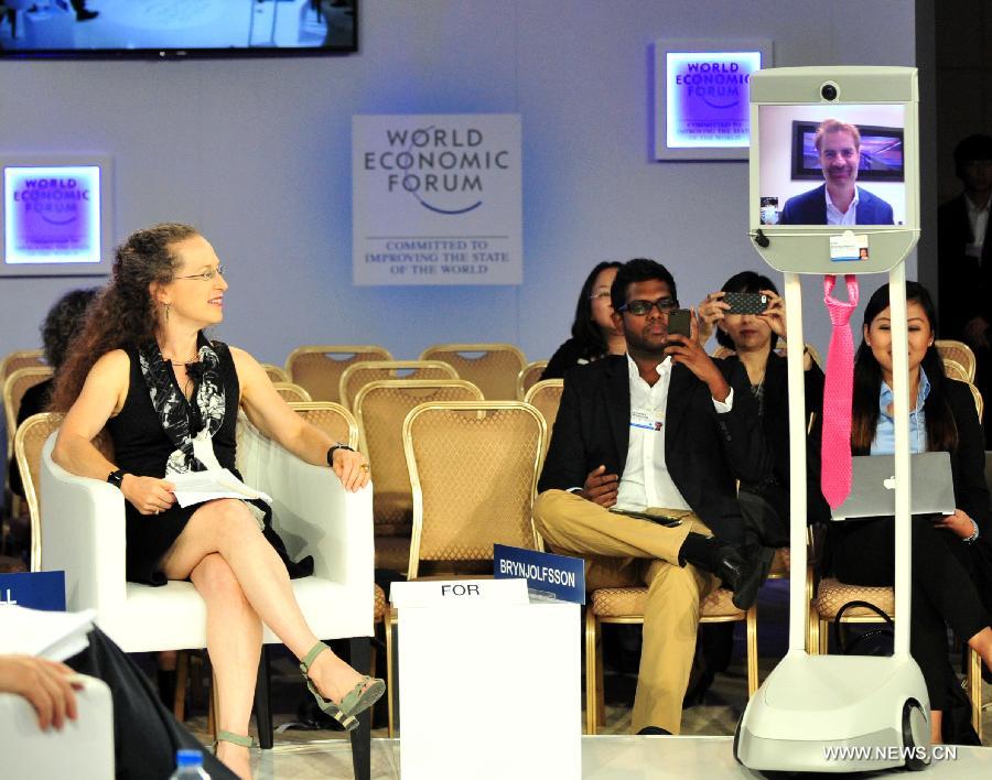 Erik Brynjolfsson, professor of MIT Sloan School of Management, takes part in a discussion through remote robot monitoring system at the Annual Meeting of the New Champions 2014, also known as the Summer Davos forum, in Tianjin, north China, Sept. 12, 2014. (Xinhua/Zhang Chenlin)