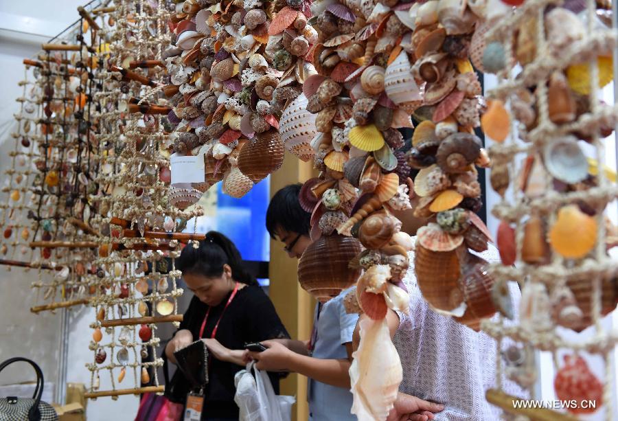 Customers buy seashell ornaments during the 11th China-ASEAN Expo (CAEXPO) in Nanning, capital of south China's Guangxi Zhuang Autonomous Region, Sept. 17, 2014. The 11th CAEXPO will be held here from Sept. 16 to 19. CAEXPO takes place annually in Nanning and is expected to promote free trade between China and the ASEAN countries. (Xinhua/Zhou Hua)
