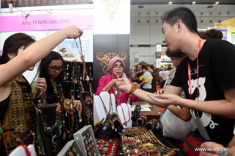 | Customers buy Malaysian jewelleries during the 11th China-ASEAN Expo (CAEXPO) in Nanning, capital of south China's Guangxi Zhuang Autonomous Region, Sept. 17, 2014. The 11th CAEXPO will be held here from Sept. 16 to 19. CAEXPO takes place annually in Nanning and is expected to promote free trade between China and the ASEAN countries. (Xinhua/Zhang Ailin) |