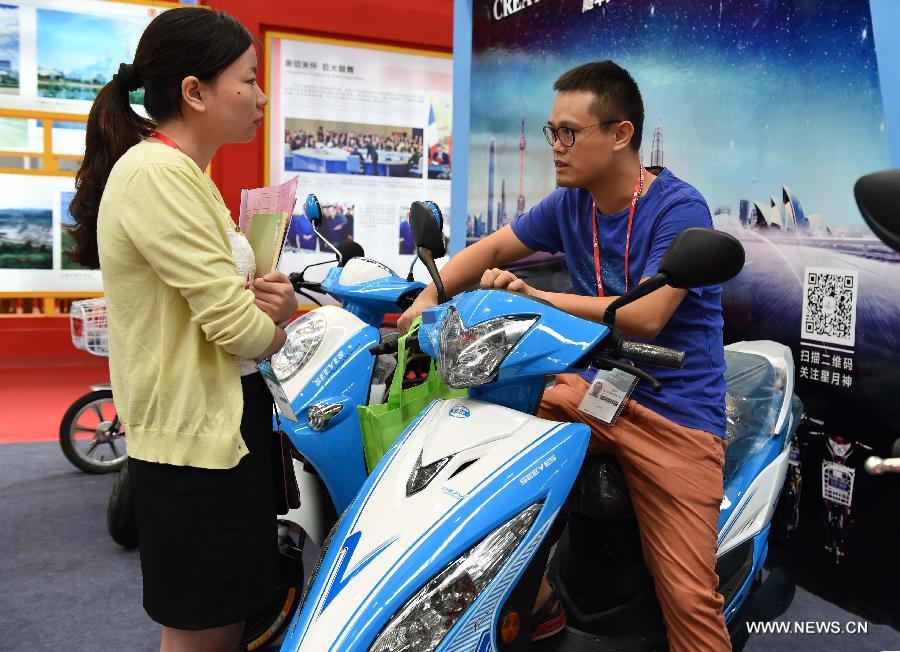 A man (R) learns about a battery-powered scooter during the 11th China-ASEAN Expo in Nanning, capital of south China's Guangxi Zhuang Autonomous Region, Sept. 17, 2014. New energy and high tech equipments attracted both exhibitors and visitors from home and abroad during the 11th CAEXPO held in Nanning from Sept. 16 to 19. CAEXPO takes place annually in Nanning and is expected to promote free trade between China and the ASEAN countries. (Xinhua/Zhou Hua)