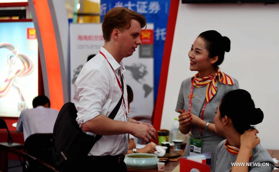 A German visits the 11th China-ASEAN Expo (CAEXPO) in Nanning, capital of south China's Guangxi Zhuang Autonomous Region, Sept. 18, 2014. The annual CAEXPO attracted worldwide visitors and businessmen who searched for markets and business opportunities. (Xinhua/Zhang Ailin)