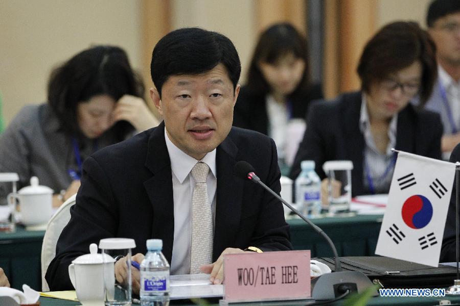 South Korean Assistant Commerce Minister Woo Tae-hee speaks during the opening ceremony of the 13th round of the China-South Korea free trade agreement negotiations in Beijing, capital of China, Sept. 22, 2014. (Xinhua/Xing Guangli)