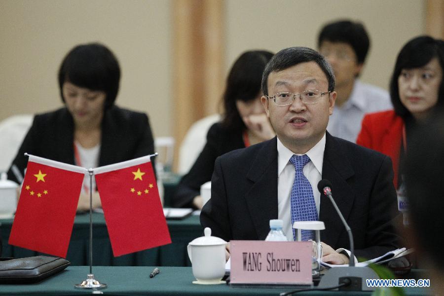 Wang Shouwen, Chinese assistant commerce minister, speaks during the opening ceremony of the 13th round of the China-South Korea free trade agreement negotiations in Beijing, capital of China, Sept. 22, 2014. (Xinhua/Xing Guangli)