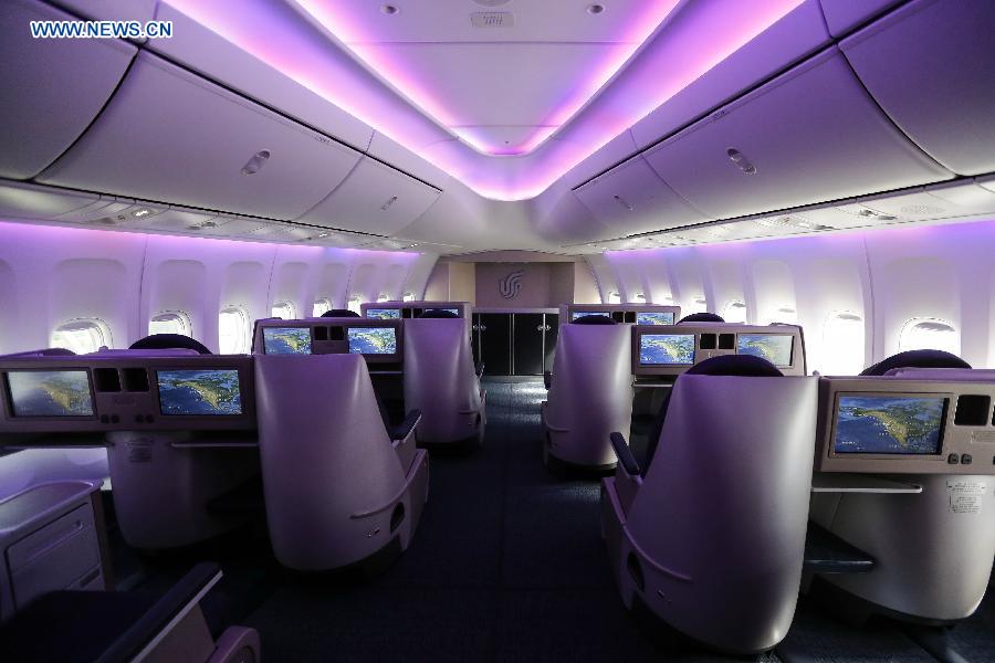 Photo taken on Sept. 30, 2014 shows the cabin of a Boeing 747-8 of Air China, China's biggest airline, in Seattle, the United States. Air China on Monday received the latest Boeing 747-8 Intercontinental airplane at a delivery ceremony in Seattle and on Wednesday flew the plane back to Beijing, China. (Xinhua/Zhang Yuwei)