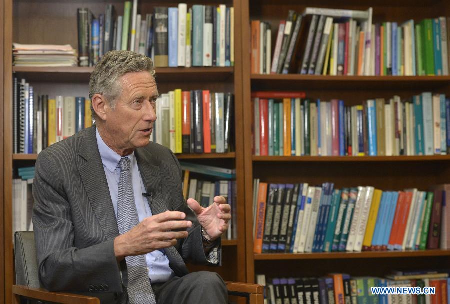 Olivier Blanchard, chief economist of the International Monetary Fund, speaks during an interview with Xinhua in Washington D.C., theUnited States, Oct. 7, 2014. China's economic growth slows but stays healthy, said Olivier Blanchard. (Xinhua/Yin Bogu)