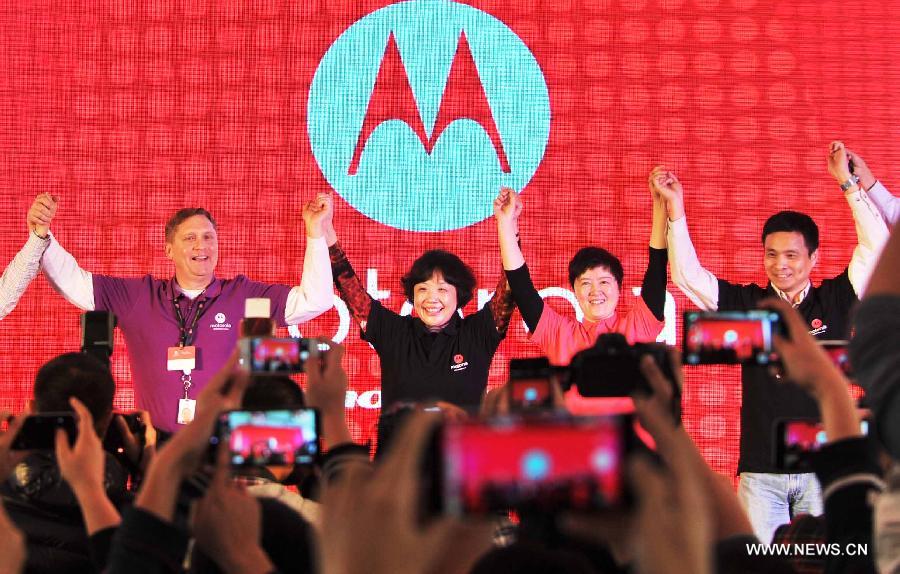 Gregg Locher (1st L), director of Business Operation at Motorola Mobility, and Lenovo Group's Senior Vice President Qiao Jian (2nd L) gesture while attending a celebration in Beijing, China, Oct. 31, 2014. Lenovo Group, the world's biggest personal computer maker, said on Oct. 30 it has fully acquired Motorola's mobile business, making Lenovo world's third largest smartphone maker. In the 2.9 billion U.S.dollar deal, Lenovo took over the Motorola brand and Motorola's portfolio of innovative smartphones like Moto X, Moto G and Moto E series, as well as the future Motorola product roadmap, said Lenovo. (Xinhua/Li Wen)