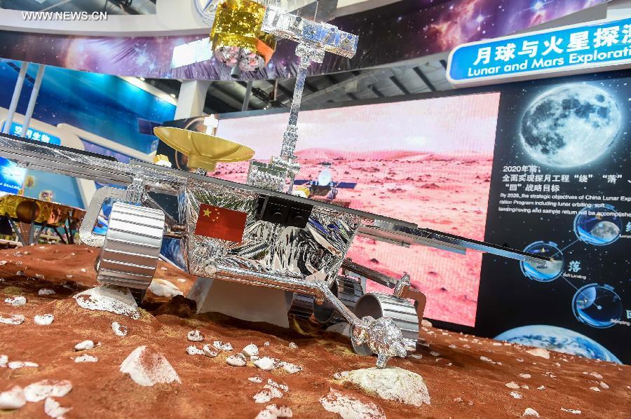 A model of the Mars rover is seen ahead of the 10th China International Aviation and Aerospace Exhibition in Zhuhai, south China's Guangdong Province, Nov. 9, 2014. Some 700 exhibitors at home and abroad with 130-plus planes will attend the six-day airshow from November 11 to 16. (Xinhua/Liang Xu)