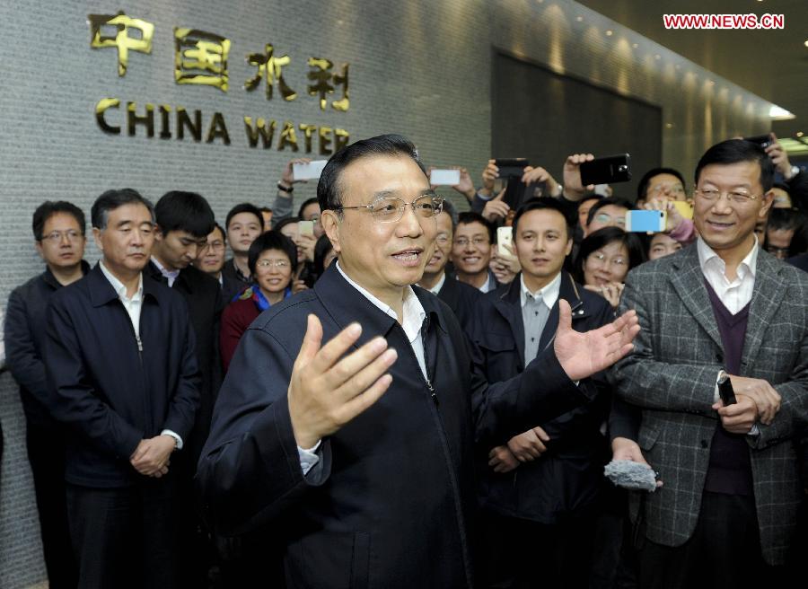 Chinese Premier Li Keqiang talks with staffs during his visit to the Ministry of Water Resources in Beijing, capital of China, Nov. 24, 2014. Li Keqiang made an inspection tour of the Ministry of Water Resources in Beijing on Monday. (Xinhua/Zhang Duo)