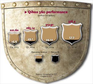 The New York Stock Exchange (NYSE)-listed company achieved revenues of $376.4 million in the third quarter of this year, soaring 100.3 percent from the same period of 2013, according to Qihoo 360's unaudited financial results for the third quarter.