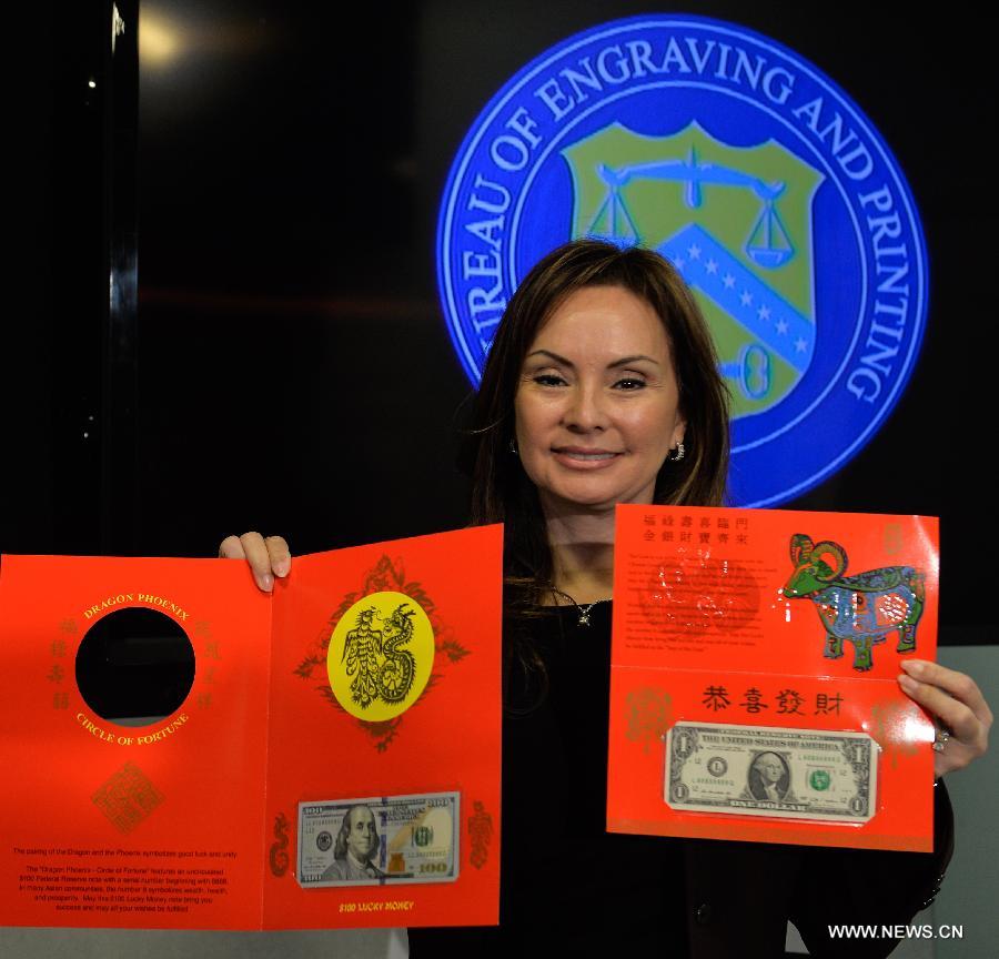 U.S. Treasurer Rosie Rios displays the "$100 Dragon-Phoenix Circle of Fortune" lucky money notes during a press conference in Washington D.C., capital of the United States, Dec. 2, 2014. The U.S. Treasury Department on Tuesday unveiled its two latest seasonal additions-- Federal Reserve note and $100 Federal Reserve note to its "Lucky Money" collections to celebrate the upcoming Chinese Lunar New Year of the Goat in 2015. (Xinhua/Bao Dandan)