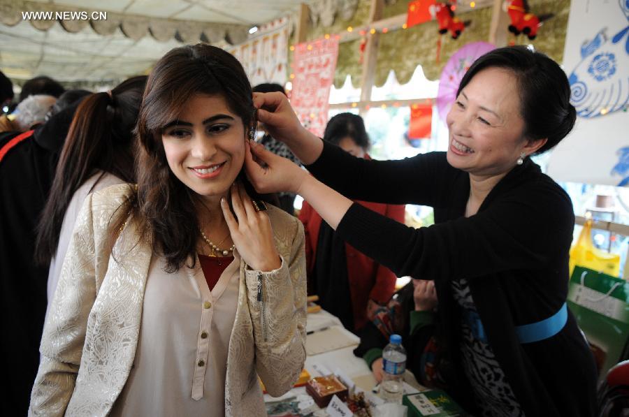 | A Pakistani girl tries Chinese jewellery at a stall during Pakistan Foreign Office Women's Association (PFOWA) Annual Charity Bazaar in Islamabad, capital of Pakistan, on Dec. 7, 2014. The one-day charity bazaar was organized by the PFOWA in collaboration with diplomatic corps in Islamabad on Sunday. (Xinhua/Ahmad Kamal) |