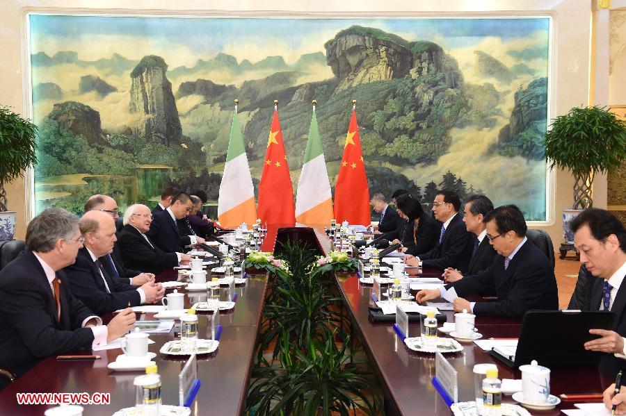 | Chinese Premier Li Keqiang (4th R) meets with Irish President Michael D. Higgins (4th L) at the Great Hall of the People in Beijing, capital of China, Dec. 10, 2014. (Xinhua/Rao Aimin) |