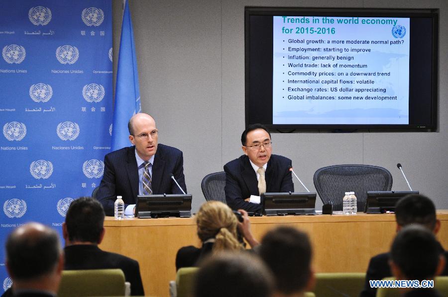 Pingfan Hong(R), Director of the Development and Policy Analysis Division for the UN Department of Economic and Social Affairs, speaks during a press conference to preview the World Economic Situation and Prospects 2015 report, at the UN headquarters in New York, on Dec. 10, 2014. Global economic growth is forecast to increase marginally over the next two years, but mounting uncertainties could undermine the growth, said a UN report launched Wednesday. (Xinhua/Niu Xiaolei)