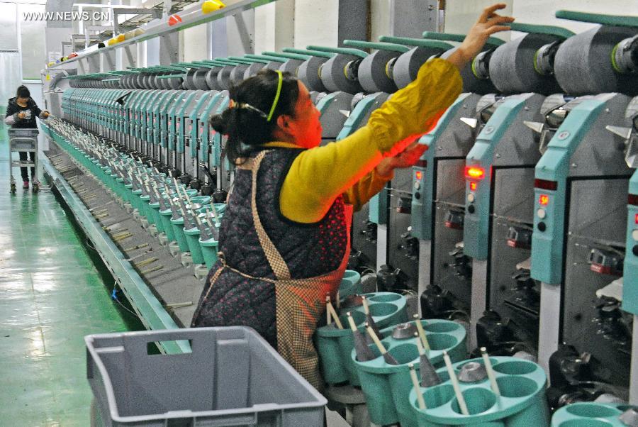 A staff member works at a production line of a textile company in the Nanxun District of Huzhou City, east China's Zhejiang Province, Dec. 25, 2014. In order to break out the bottleneck of economic development, a series of technical transformation was launched in traditional manufacturing industry in the Nanxun District of Huzhou in 2014. (Xinhua/Tan Jin)