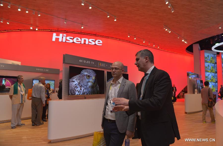 Visitors view UHDTV at the booth of Chinee company Hisense during the 2015 International Consumer Electronics Show (CES) in Las Vegas, the United States, on Jan. 6, 2015. More than 1,000 Chinese enterprises participated in this year's CES. (Xinhua/Yin Bogu)