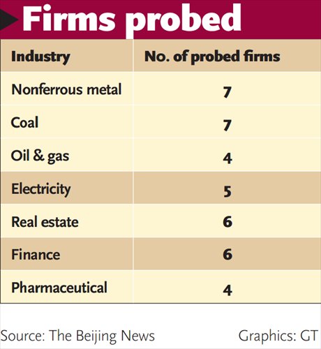 According to The Beijing News, 18 companies from the energy and natural resources sectors, including nonferrous metal, coal, oil and gas industries have been tainted by corruption scandals, roughly one-quarter of the total number.