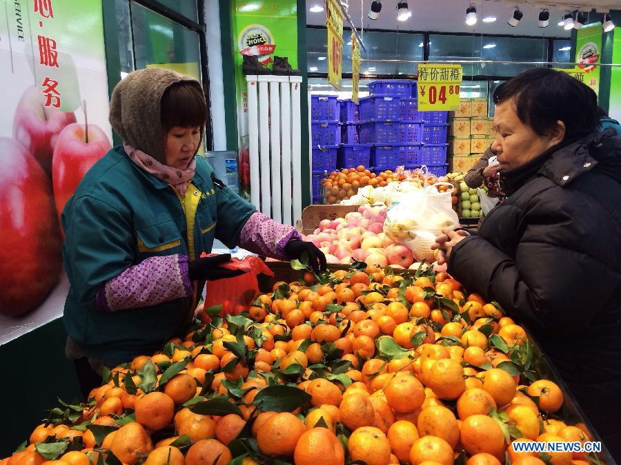 A resident purchases fruits at a supermarket in Changchun, capital of northeast China's Jilin Province, Feb. 10, 2015. China's consumer price index, the main gauge of inflation, grew 0.8 percent year on year in January, the slowest rise in more than five years, the National Bureau of Statistics said on Tuesday. (Xinhua/Lin Hong)