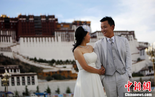 A couple takes wedding photo in front of Potala Palace. (CNS/Du Yang)
