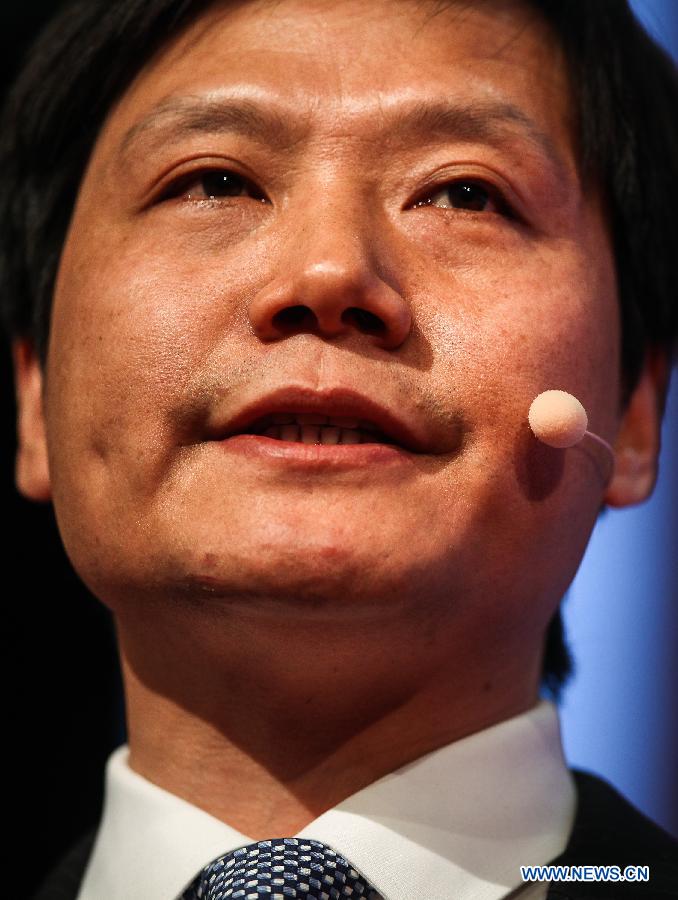 Lei Jun, CEO of Xiaomi Tech, speaks during a summit session of 2015 CeBIT Technology Trade fair in Hanover, Germany, on March 16, 2015. Top IT business fair CeBIT 2015, which features a strong Chinese presence, opened on Sunday in Germany. (Xinhua/Zhang Fan)