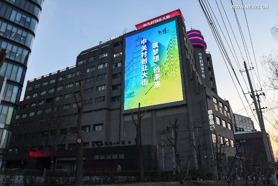 Photo taken on March 13 shows a screen displaying slogans about innovation on a building at Zhongguancun Innovation Street in the Haidian District of Beijing, capital of China. The impact of e-commerce made the street which once was home to shops selling books and clothes a new place for technological innovation. In the past half year, the street attracted over 20 agencies providing services for startups, over 200 funded projects and nearly 500 activities, which helped lots of people realize their dreams. (Xinhua/Luo Xiaoguang)