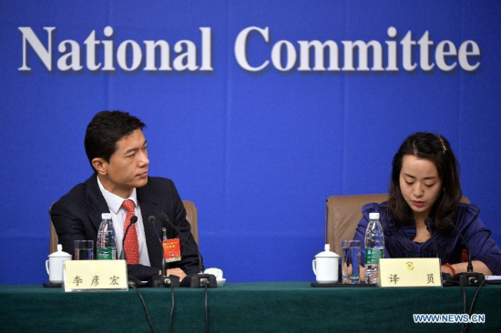| Robin Li is at a press conference during the third session of the 12th CPPCC National Committee in Beijing, capital of China, March 11, 2015. (Xinhua/Li Xin) |
