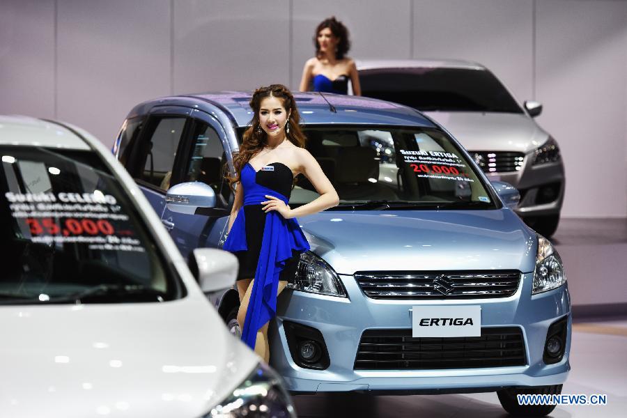 A model poses beside a Suzuki car exhibited in the 36th Bangkok International Motor Show in Bangkok, March 25, 2015. The Bangkok International Motor Show will be held from March 25 to April 5. (Xinhua/Li Mangmang)