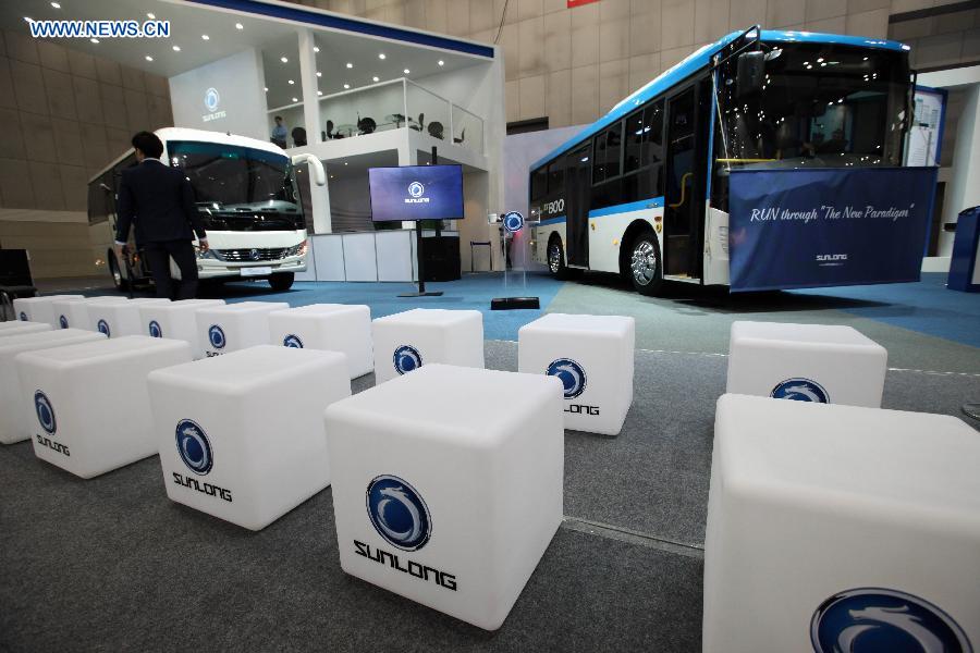 A visitor looks at a Shanghai Sunlong Bus at the Seoul Motor Show in Seoul, South Korea, April 2, 2015. Shanghai Sunlong Bus, a Chinese automaker, showcases its strategic model CT Boo for the first time at this year's Seoul Motor Show. (Xinhua/Seongbin Kang)