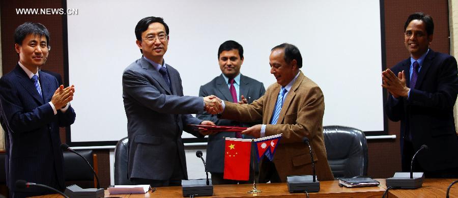 Secretary of Nepal's Ministry of Finance Suman Prasad Sharma (2nd R) and Chinese Ambassador to Nepal Wu Chuntai (2nd L) shake hands during a signing ceremony of a memorandum of understanding(MoU) at the Ministry of Finance in Kathmandu, Nepal, April 10, 2015. According to the MoU, China agreed to provide funds under the economic and technical cooperation for the project of Timure Frontier Inspection in Rasuwagadi and technical assistance in Nepal's long-term agricultural development plan. (Xinhua/Sunil Sharma)