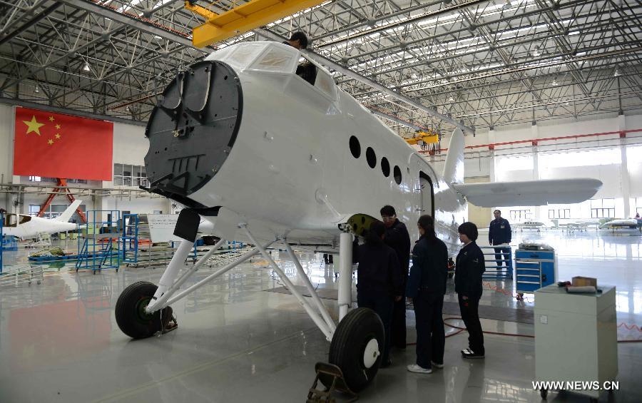 Technicians work on an aircraft production line of the Aviation Industry Corporation of China (AVIC) in Shijiazhuang, capital of north China's Hebei Province, March 3, 2015. China's GDP expanded 7 percent year-on-year in the first quarter, the National Bureau of Statistics(NBS) data showed on April 15, 2015. (Xinhua/Wang Xiao)