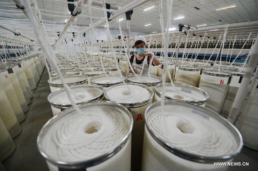 A woman works at the factory of Tanglong textile group in north China's Hebei Province, April 14, 2015. China's GDP expanded 7 percent year-on-year in the first quarter, the National Bureau of Statistics(NBS) data showed on April 15, 2015.(Xinhua/Zhu Xudong)